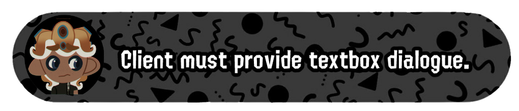 Character MUST be provided with at least some form of design with color. Character information required by client if desired.